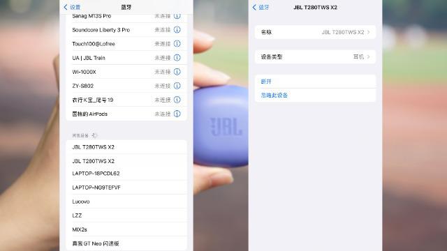 JBL T280 X2風(fēng)信紫采用了藍(lán)牙5.3芯片,提升了傳輸穩(wěn)定性降低了功耗。首次打開充電艙的上改后,就可以在藍(lán)牙設(shè)置里看到JBL T280TWS X2字樣,只需要單擊即可成功連接。細(xì)心的你應(yīng)該看到了再列表里出現(xiàn)了兩個相同的字樣,這是因為JBL T280 X2風(fēng)信紫的兩個耳機是采用的雙主機設(shè)計,隨便一個耳機都可以單獨連接設(shè)備使用,左右耳同步傳輸能夠降低延時。當(dāng)然了,既然采用了藍(lán)牙5.3芯片就不能浪費,可以通過智能操控(單擊左耳/右耳5次)進入游戲模式,也就是進入了更低延遲的狀態(tài),實現(xiàn)音畫同步。
